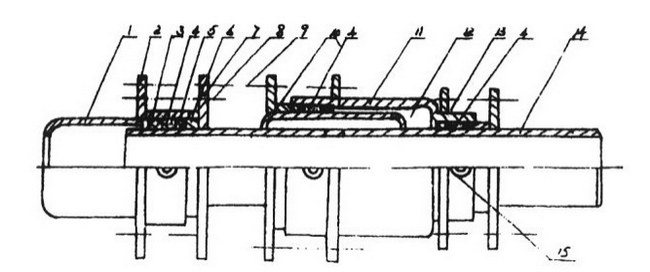 1.后管套體2.固定法蘭3.定型石墨填料4.注油池5.填料室6.填料壓緊圈7.壓蓋法蘭8.壓蓋螺絲9.連接螺絲10.汽室填料室11.汽室體12.汽室13.汽室小填料室14.伸縮管15.注油孔。