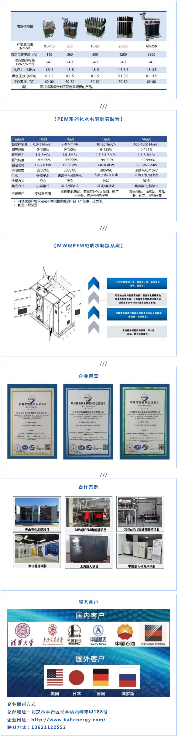公司的研究及工程技術(shù)團隊積累了二十多年航天電解水制氫應(yīng)用研究和技術(shù)開發(fā)經(jīng)驗,具備全方位產(chǎn)品持續(xù)升級迭代的研發(fā)能力,單電解槽產(chǎn)氫量可覆蓋0.3-250 Nm3/h全范圍,其中MW級單槽PEM電解槽的產(chǎn)業(yè)化和商業(yè)應(yīng)用,解決了可再生能源制取綠氫的“卡脖子”關(guān)鍵技術(shù),填補了國內(nèi)空白。產(chǎn)品已成功服務(wù)于中石化、中國航天、中石油、浙能、清華、上海交大以及美國、日本、德國等眾多重點客戶。