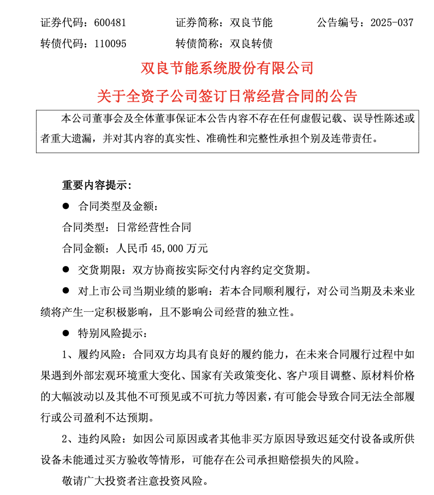 6月11日晚間,雙良節(jié)能系統(tǒng)股份有限公司(股票代碼:600481)發(fā)布公司,旗下全資子公司江蘇雙良新能源裝備有限公司(以下簡(jiǎn)稱“雙良新能源”)與閎揚(yáng)新能源發(fā)展集團(tuán)吉林有限公司簽署《福??h光儲(chǔ)氫氨醇一體化項(xiàng)目買賣合同》,合同金額達(dá)4.5億元。